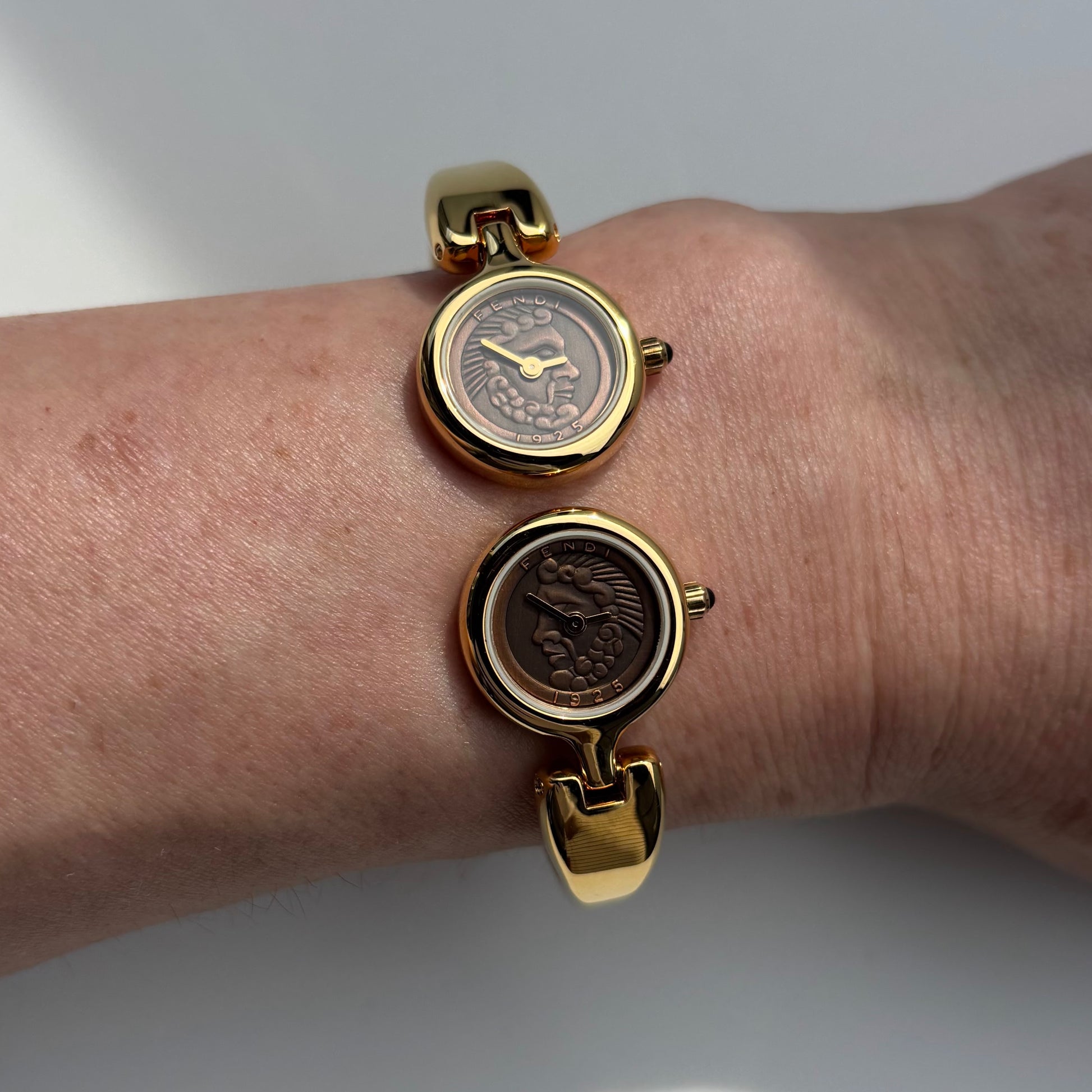 Fendi 1990s Seashell Dial Two Time Zone Gold Plated Bangle Watch