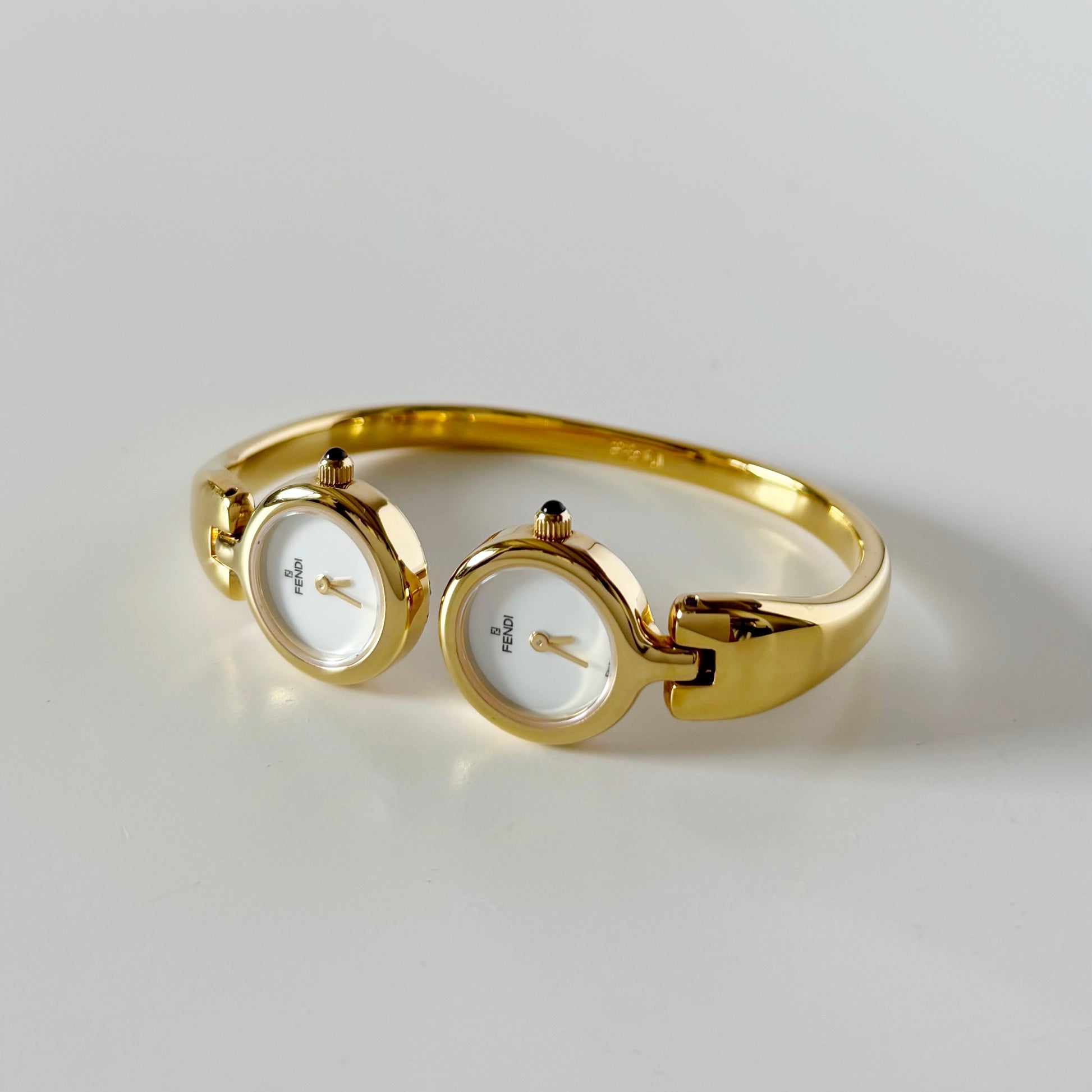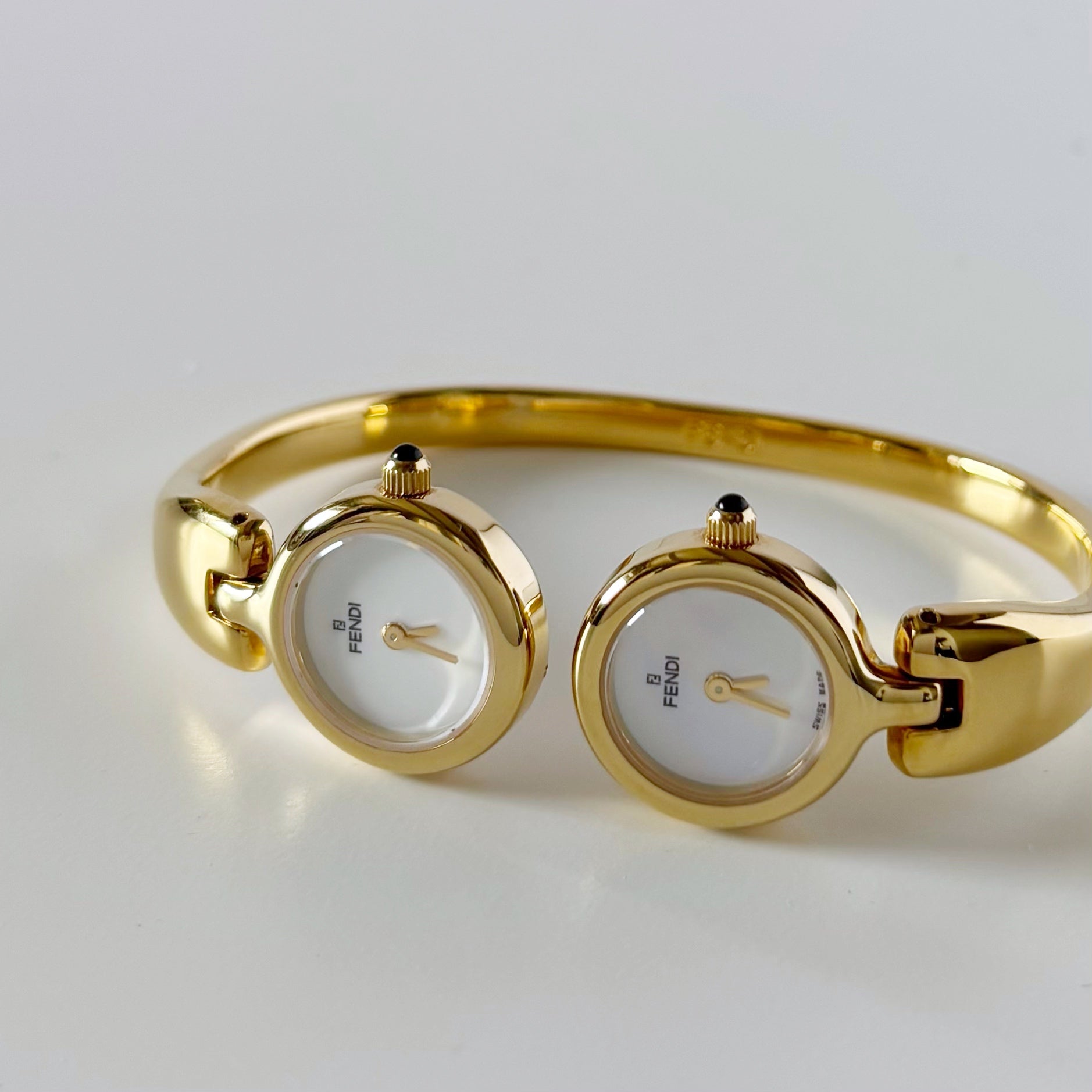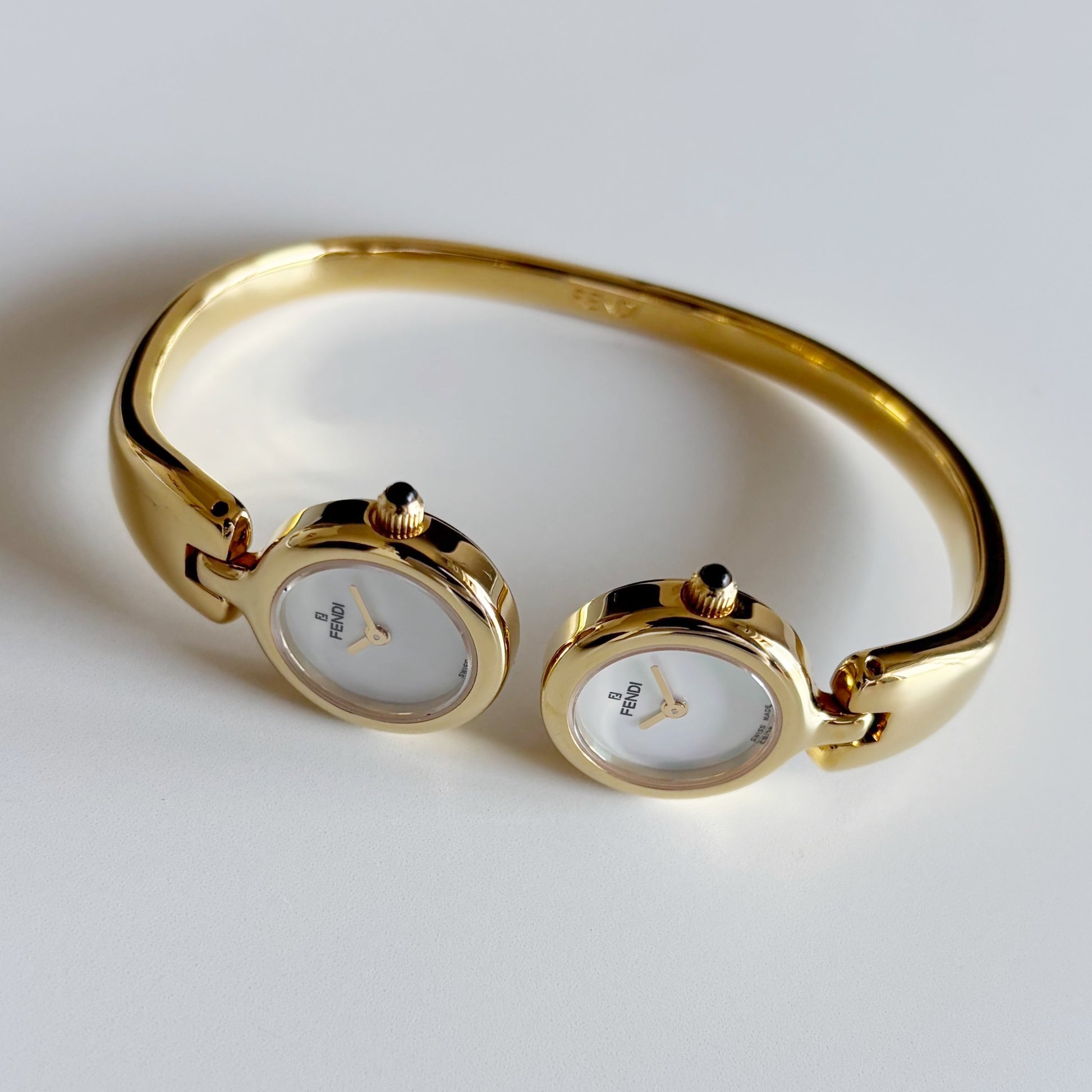 Fendi 1990s Seashell Dial Two Time Zone Gold Plated Bangle Watch