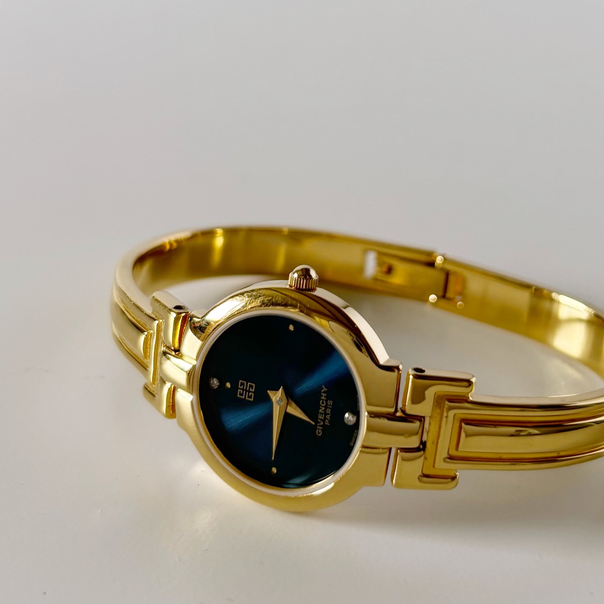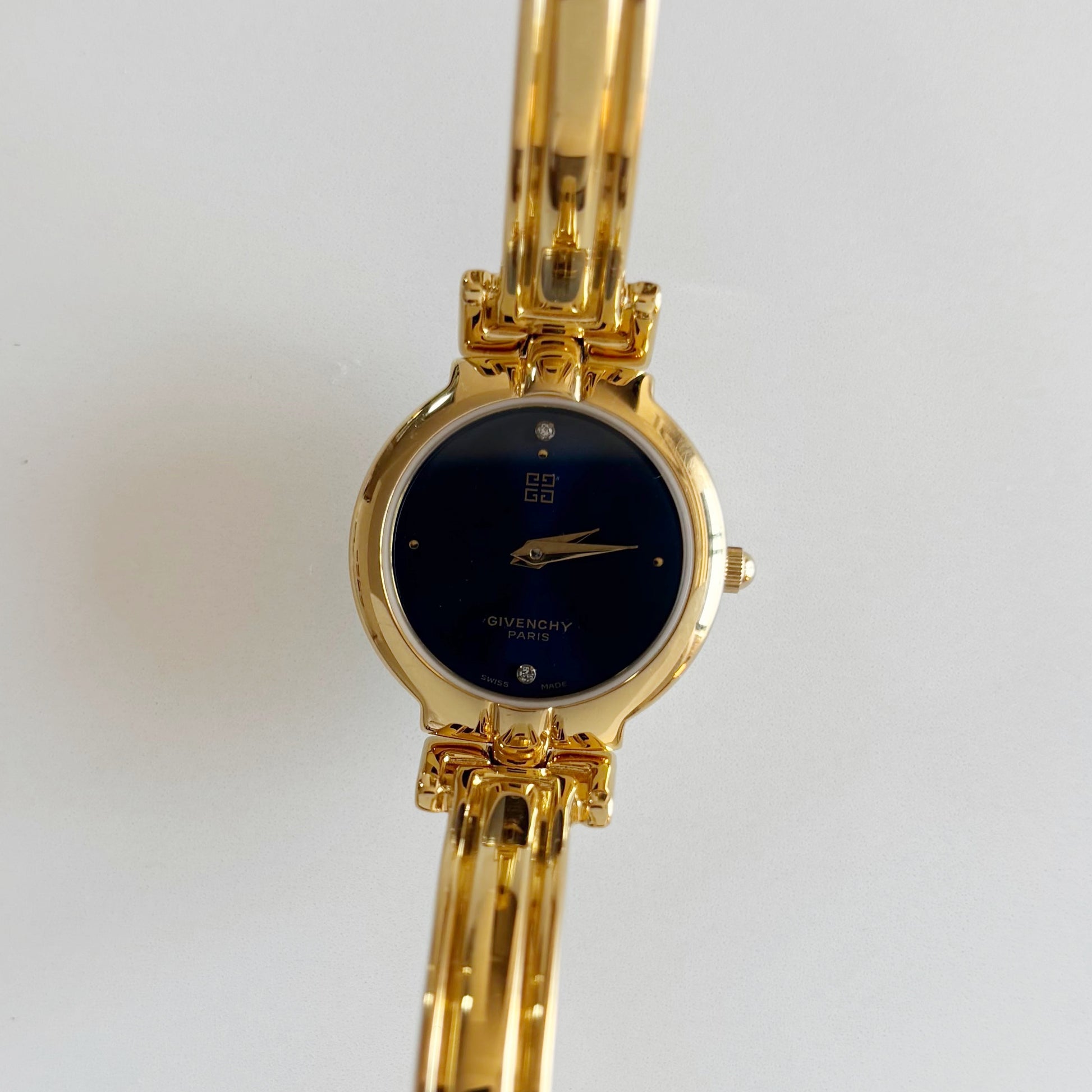 Givenchy 1990s Navy Round Dial Gold Plated Bangle Watch