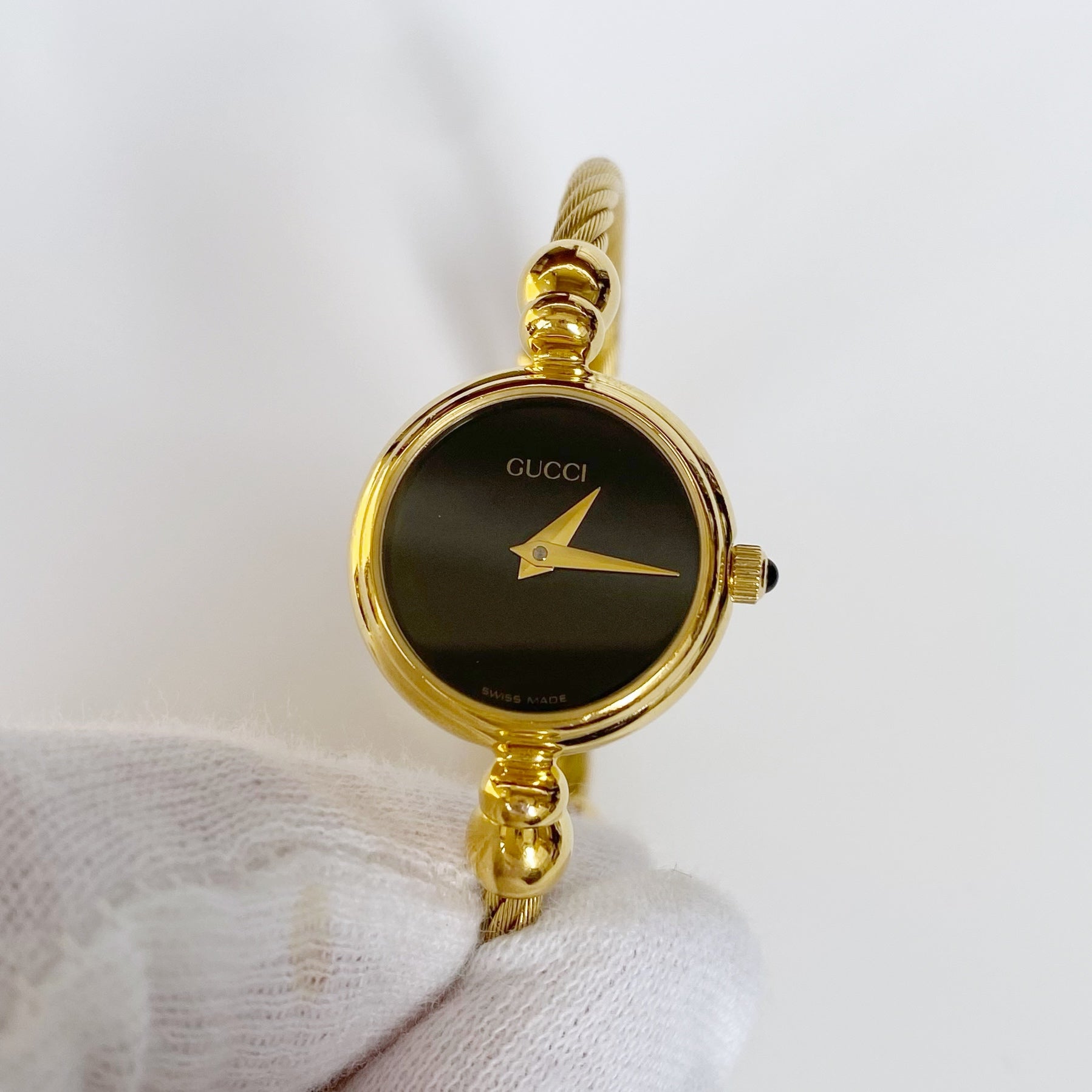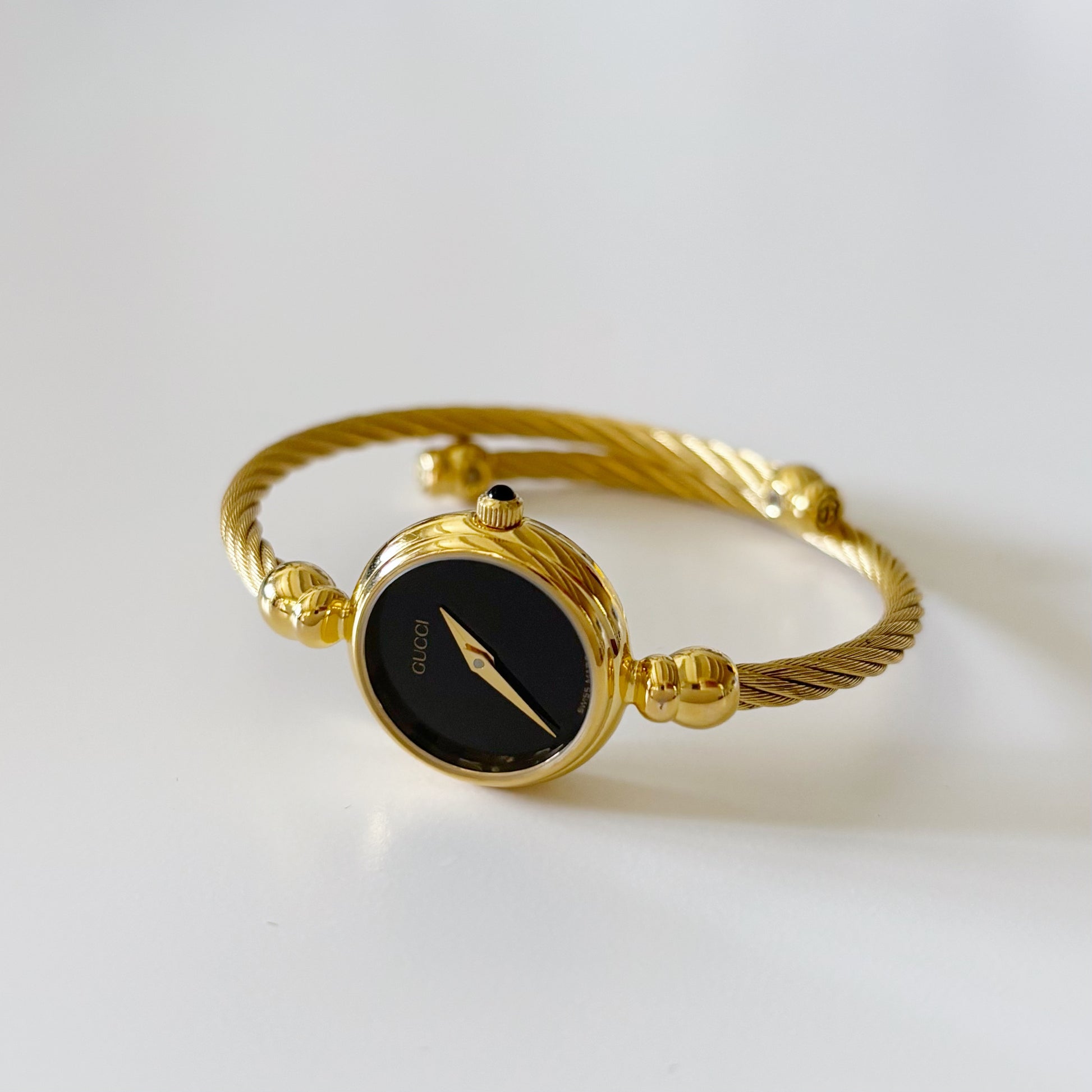 Gucci 1990s Black Dial Gold Plated Cable Bangle Watch