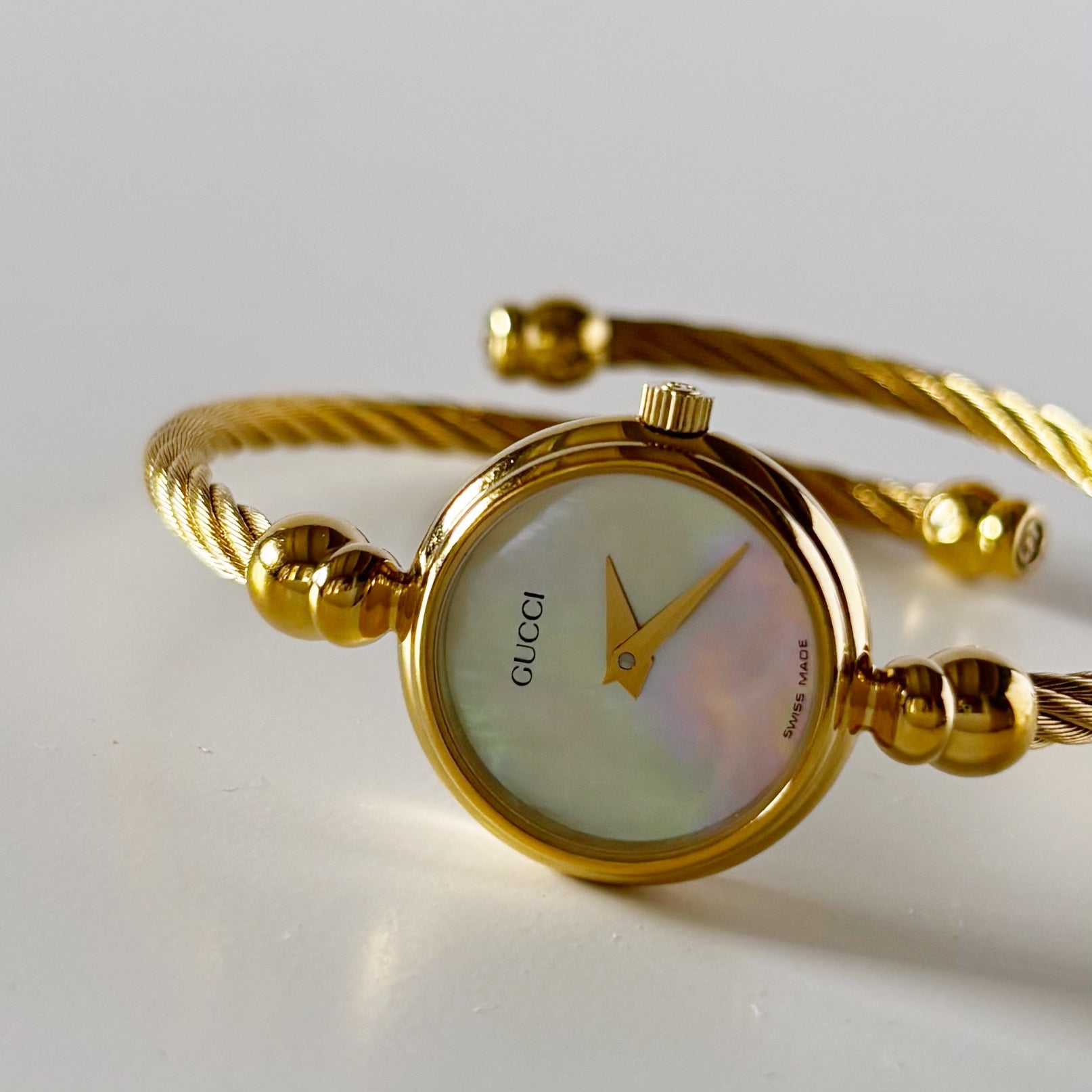 Gucci 1990s Seashell Dial Gold Plated Cable Bangle Watch