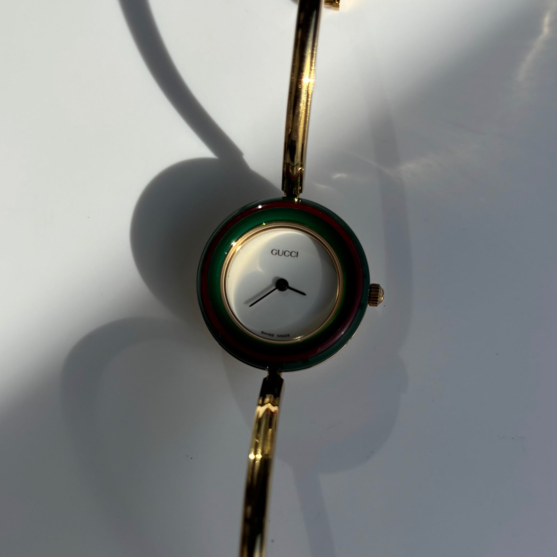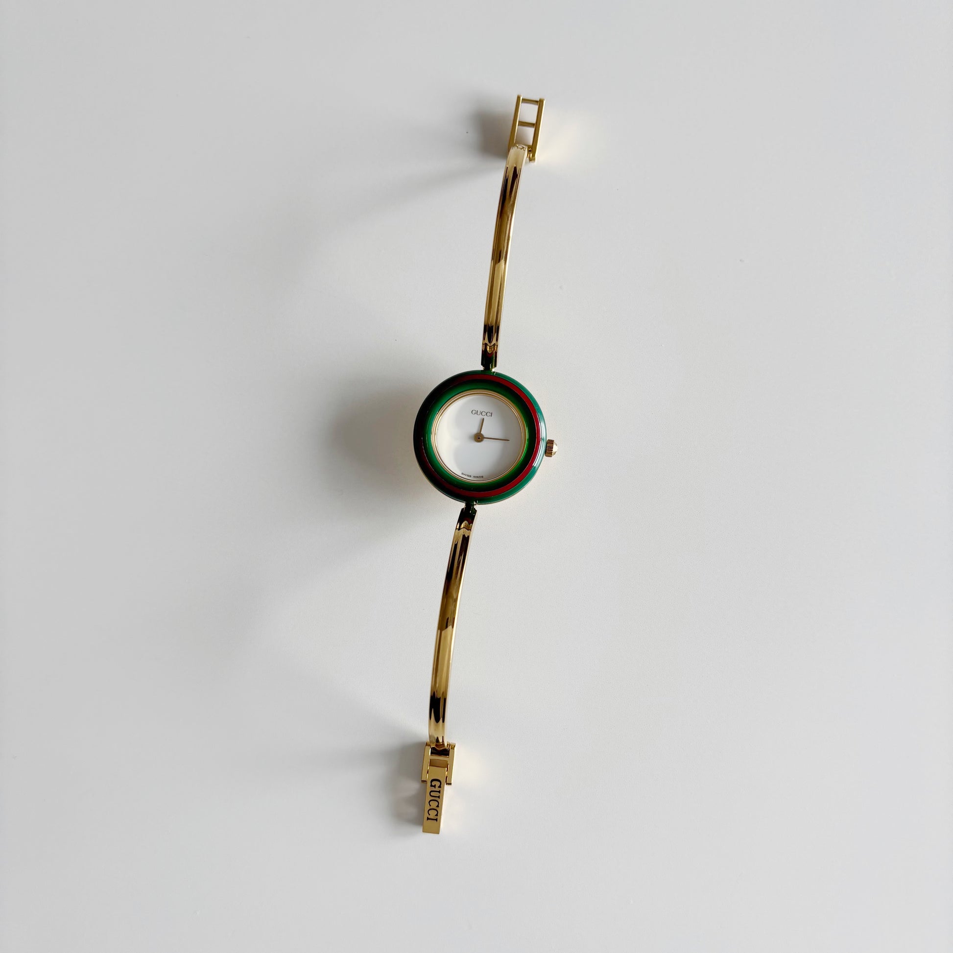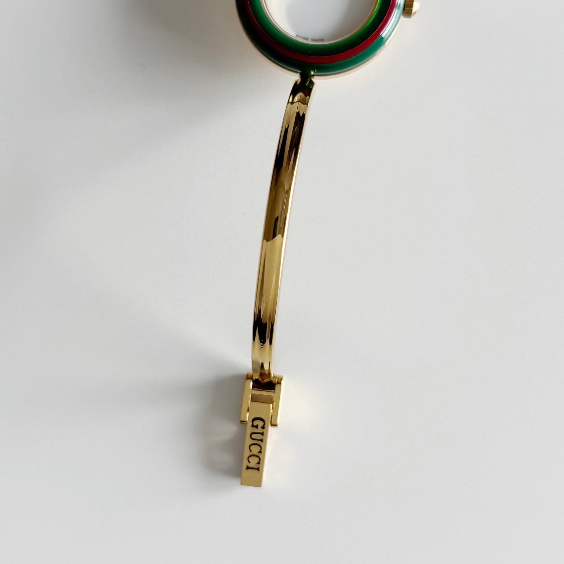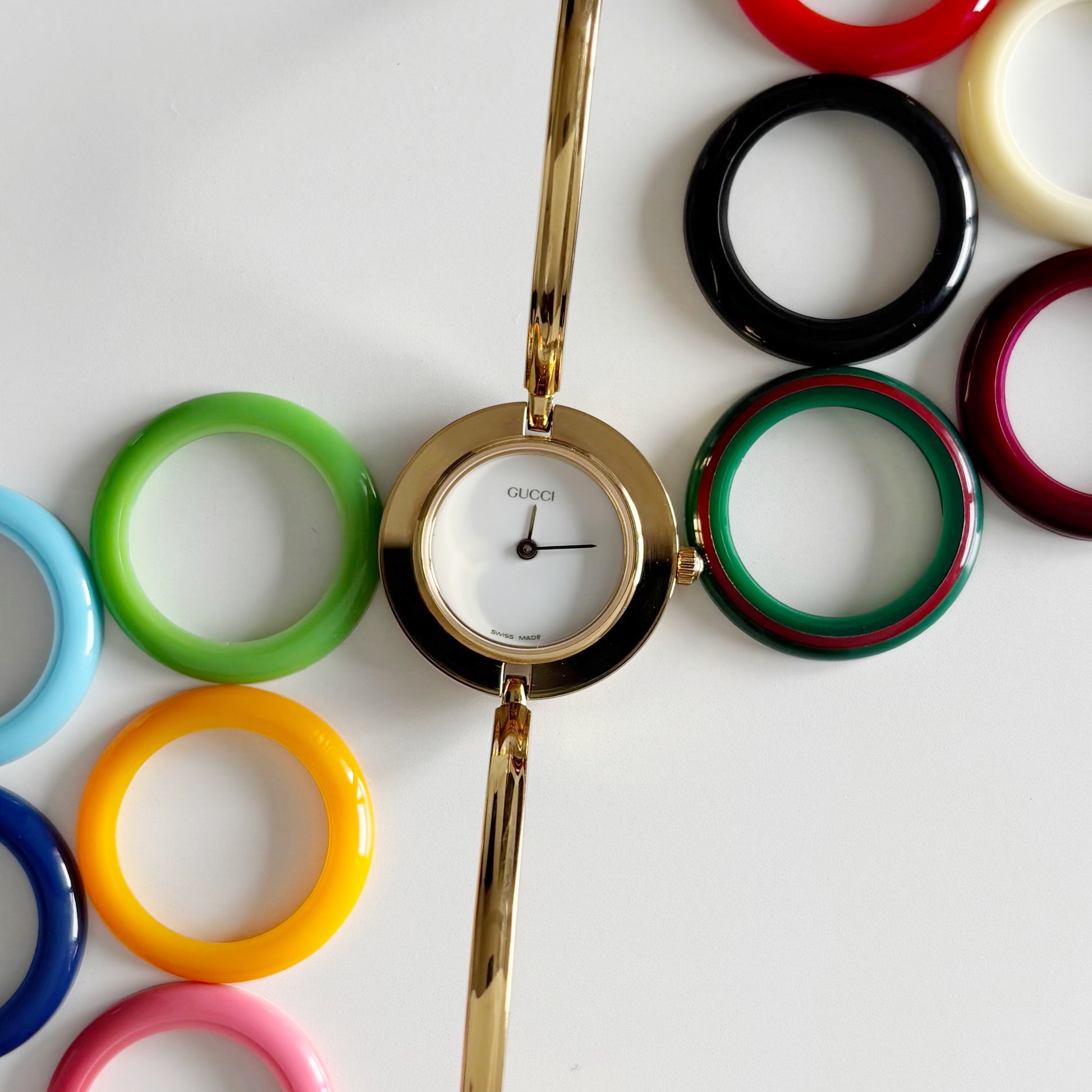 Gucci 1990s Interchangeable Bezel Gold Plated Bangle Watch with 12 bezels, case