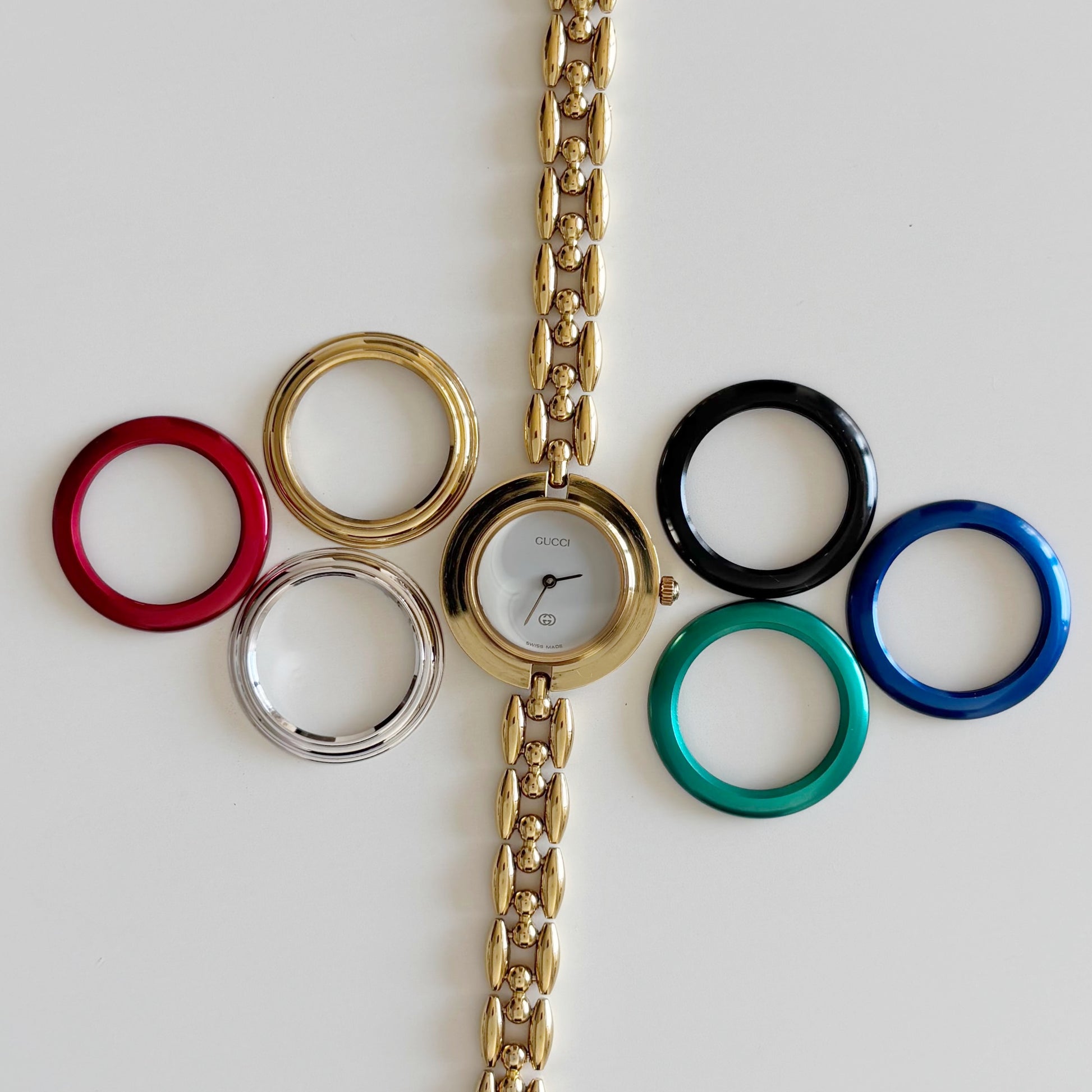 Gucci 1990s Interchangeable Bezel Gold Plated Watch with 6 bezels, case (167mm)