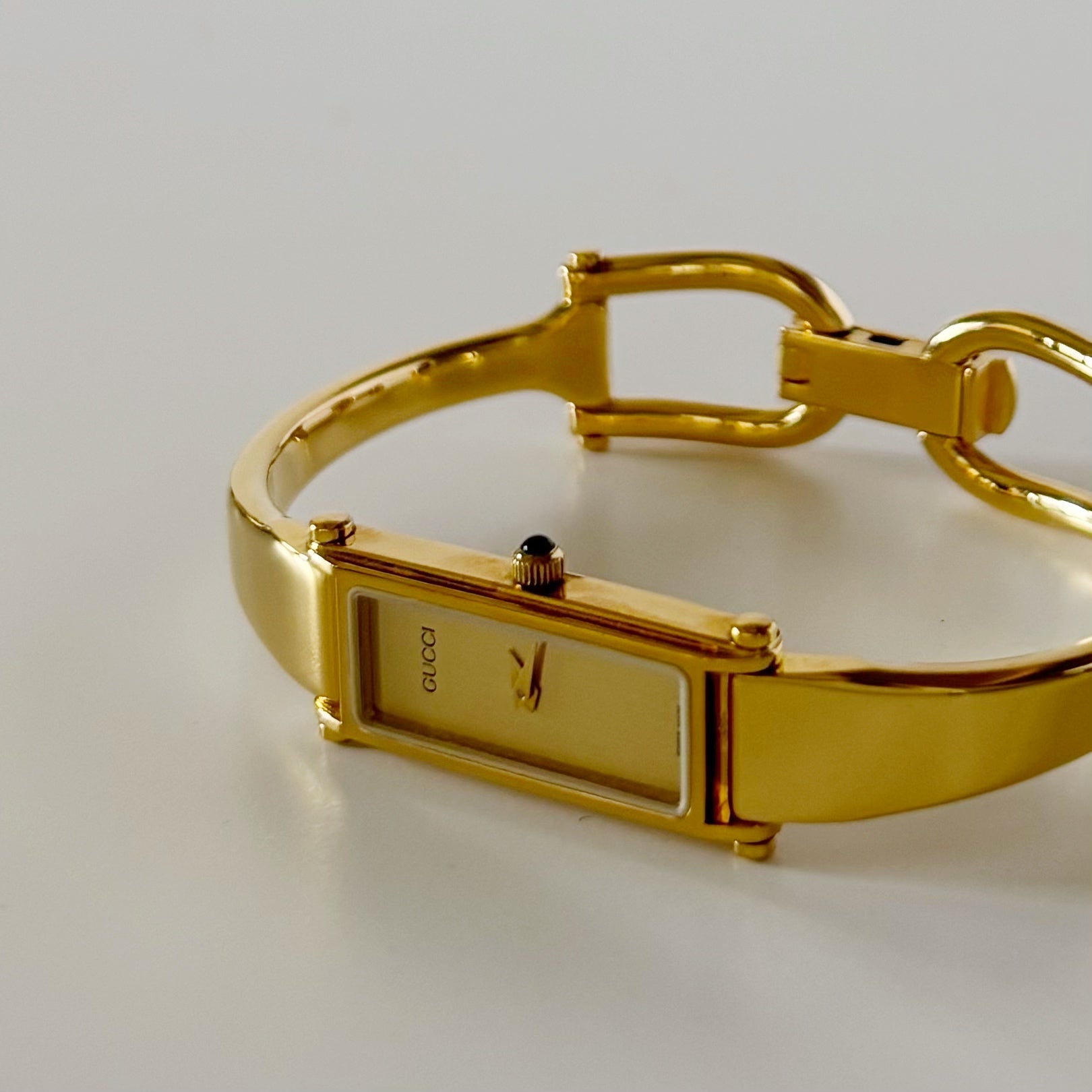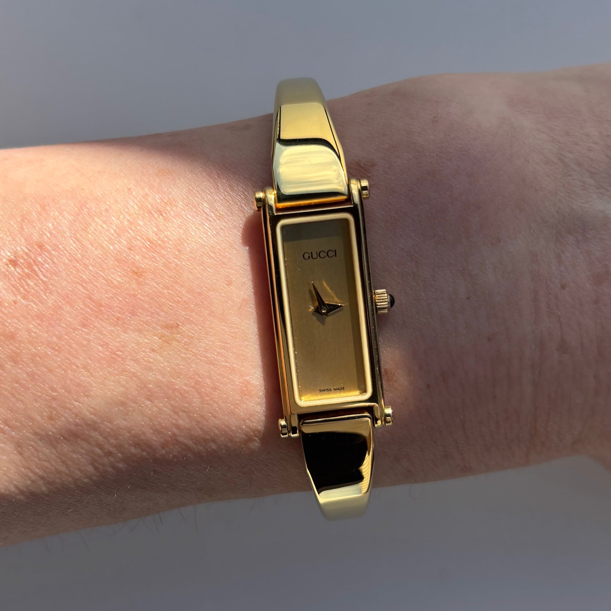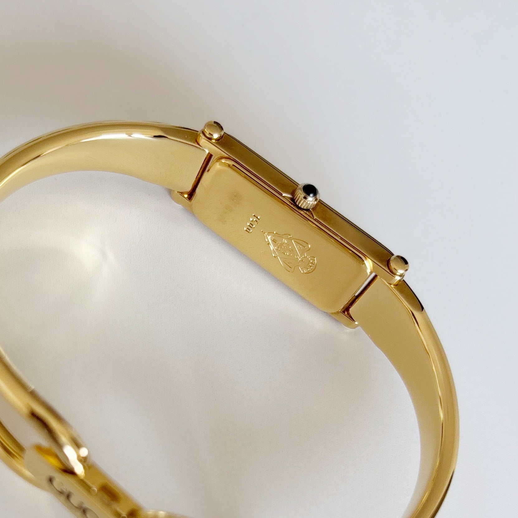 Gucci 1990s Rectangular Gold Dial Gold Plated Bangle Watch