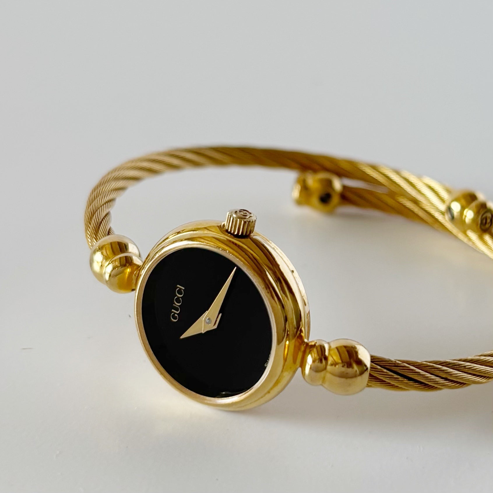 Gucci 1990s Black Dial Gold Plated Cable Bangle Watch