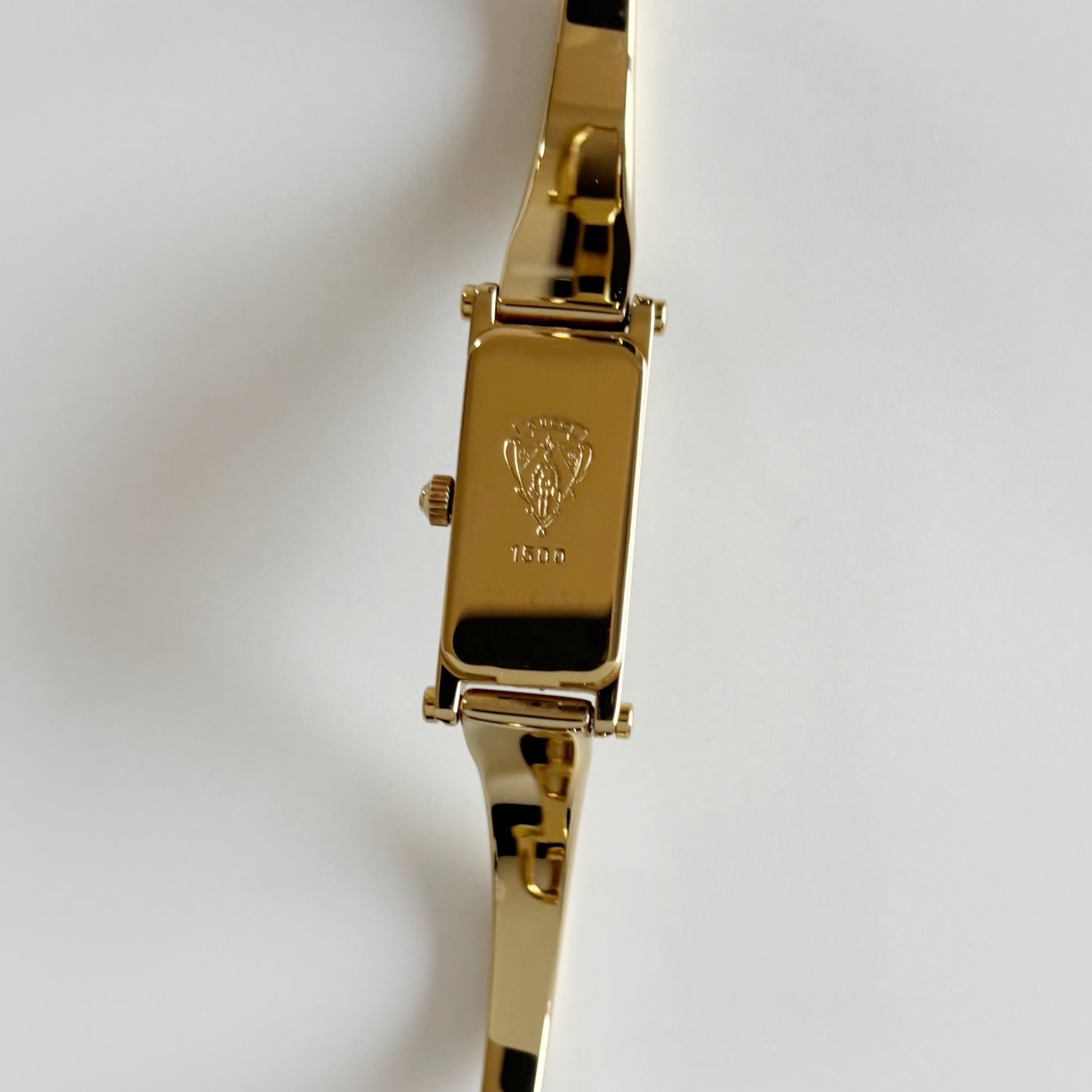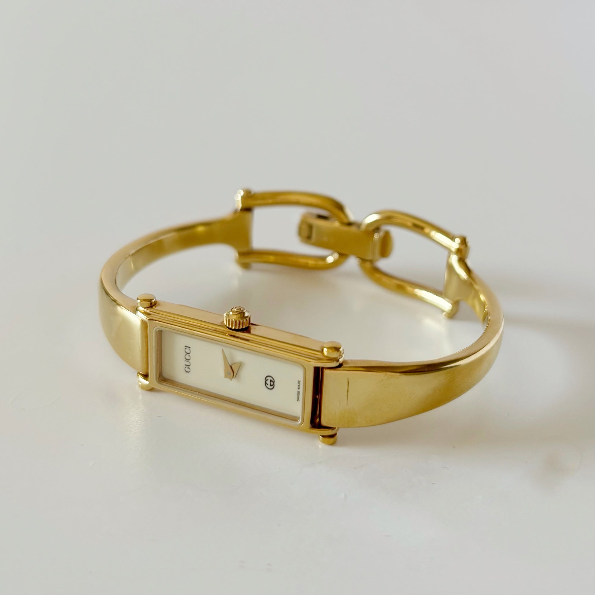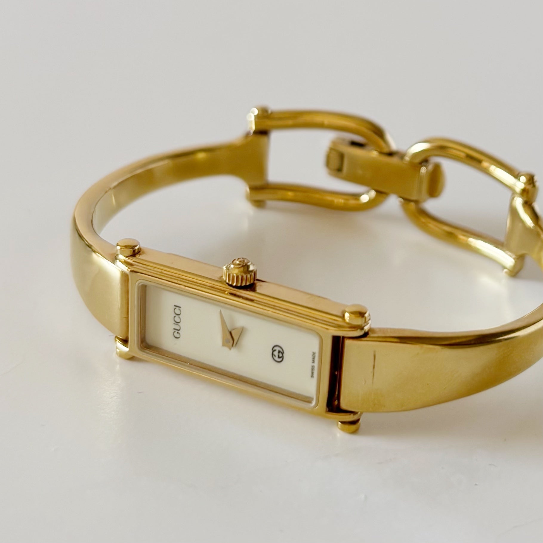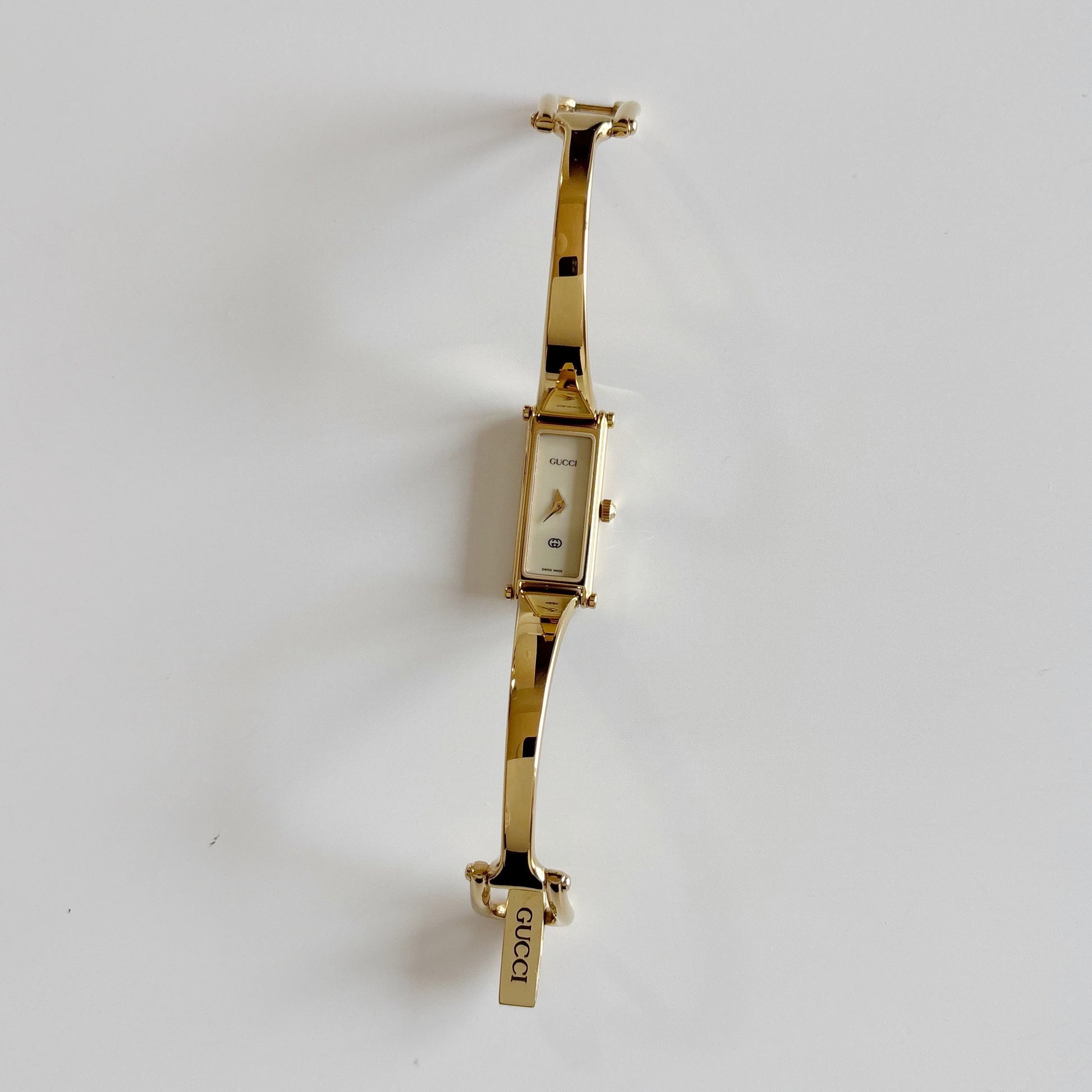 Gucci 1990s Cream Dial Rectangular Gold Plated Bangle Watch