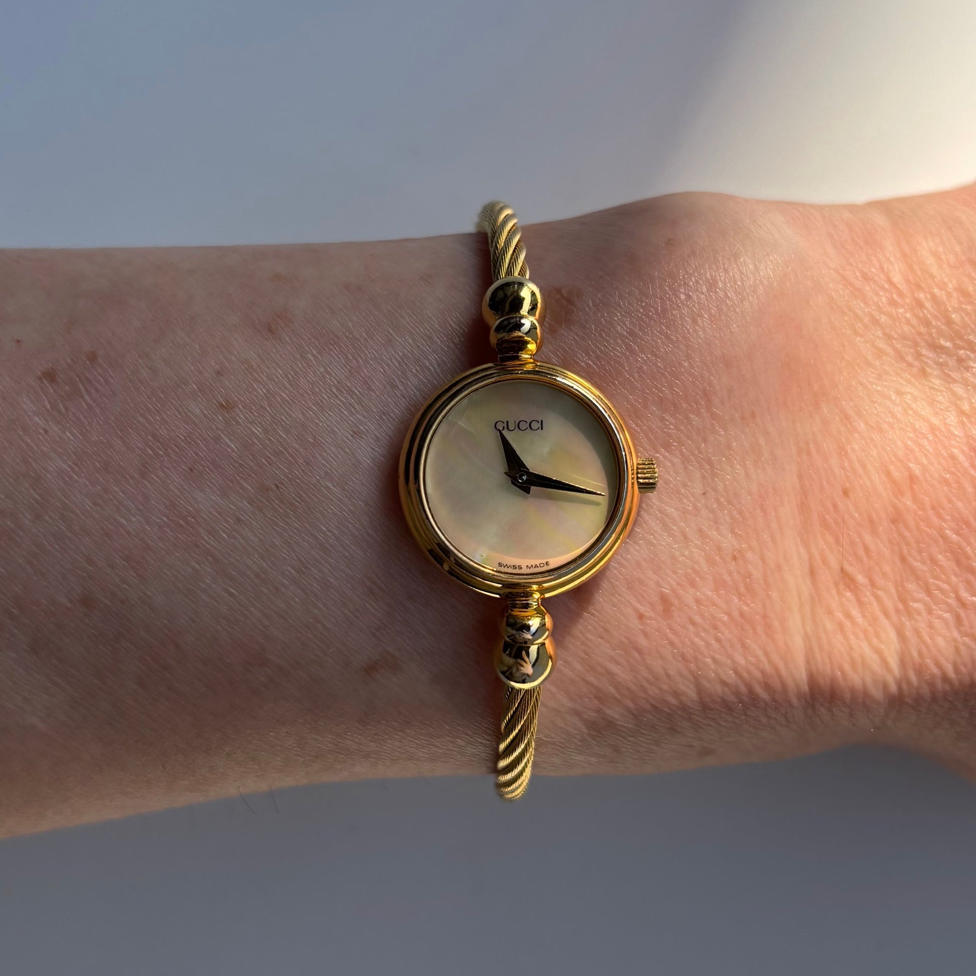 Gucci 1990s Seashell Dial Gold Plated Cable Bangle Watch